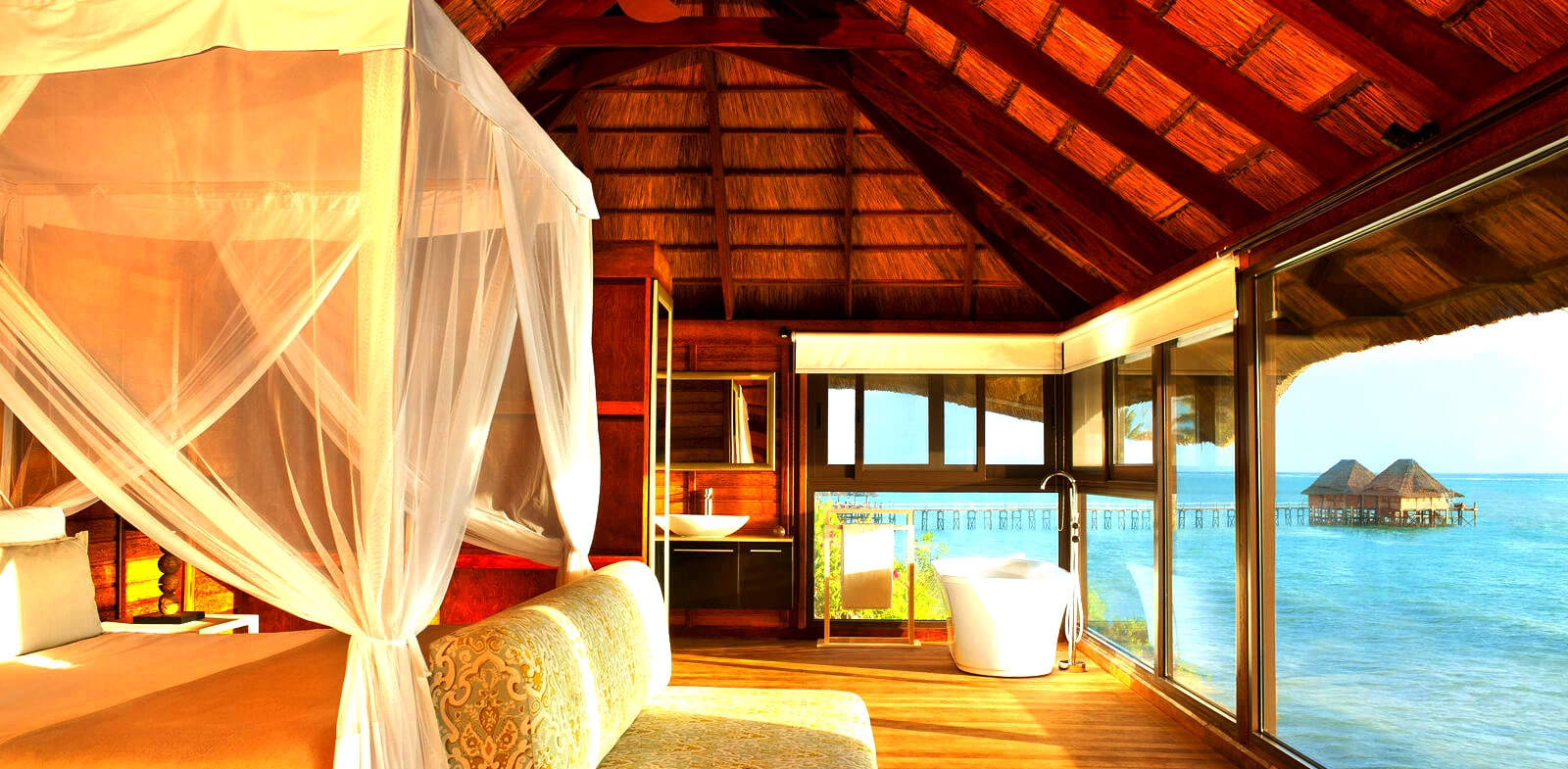 Calatorii indragostiti de natura si dornici de experiente inedite pot opta pentru Romance Ocean Front Pavilion, unde geamurile pana jos lasa oceanul sa fie descoperit cu toate vibratiile.