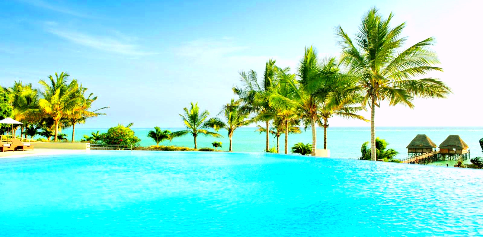 Piscina resortului de tip infinity este inconjurata de palmieri si de frumusetea Oceanului Indian.